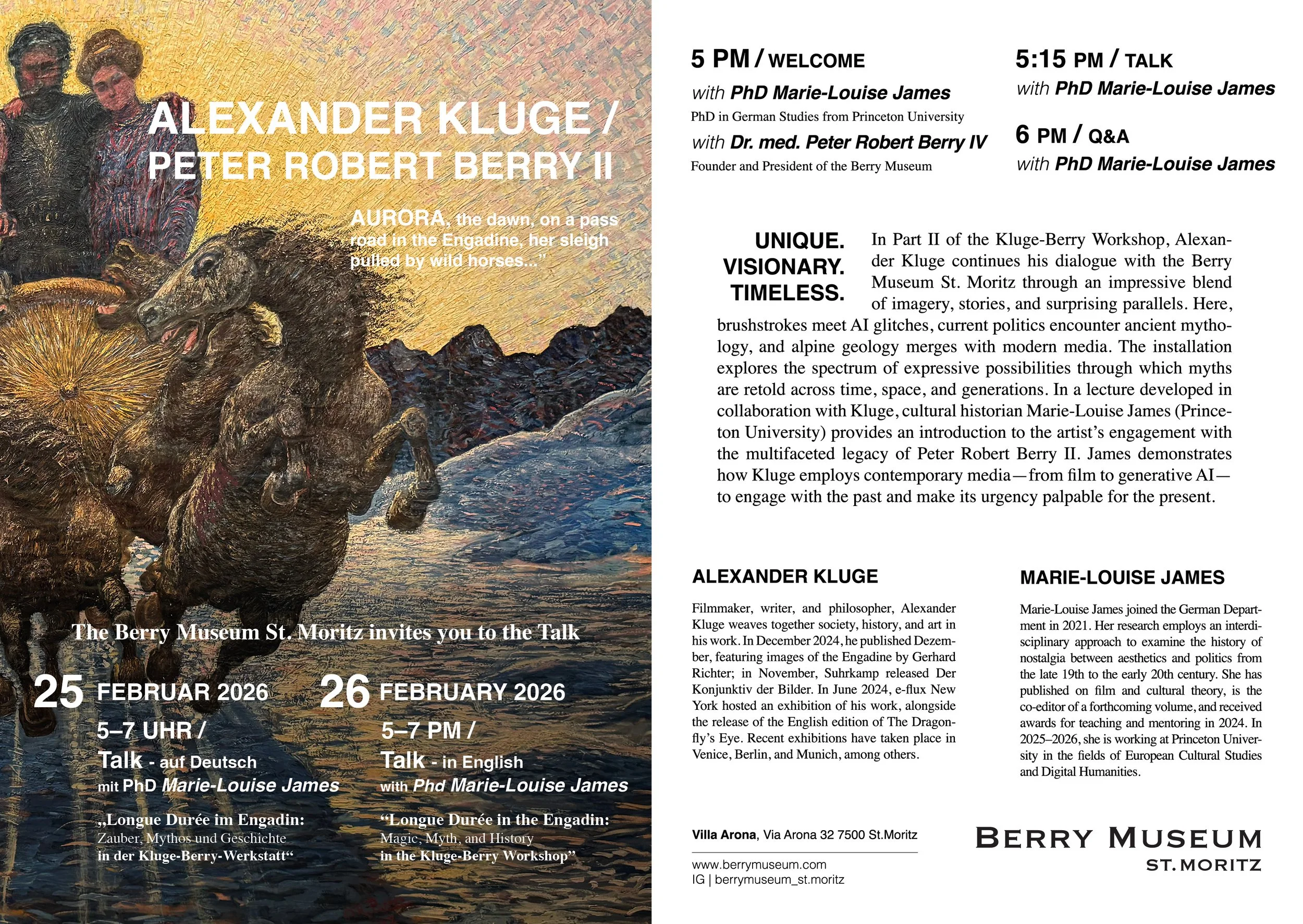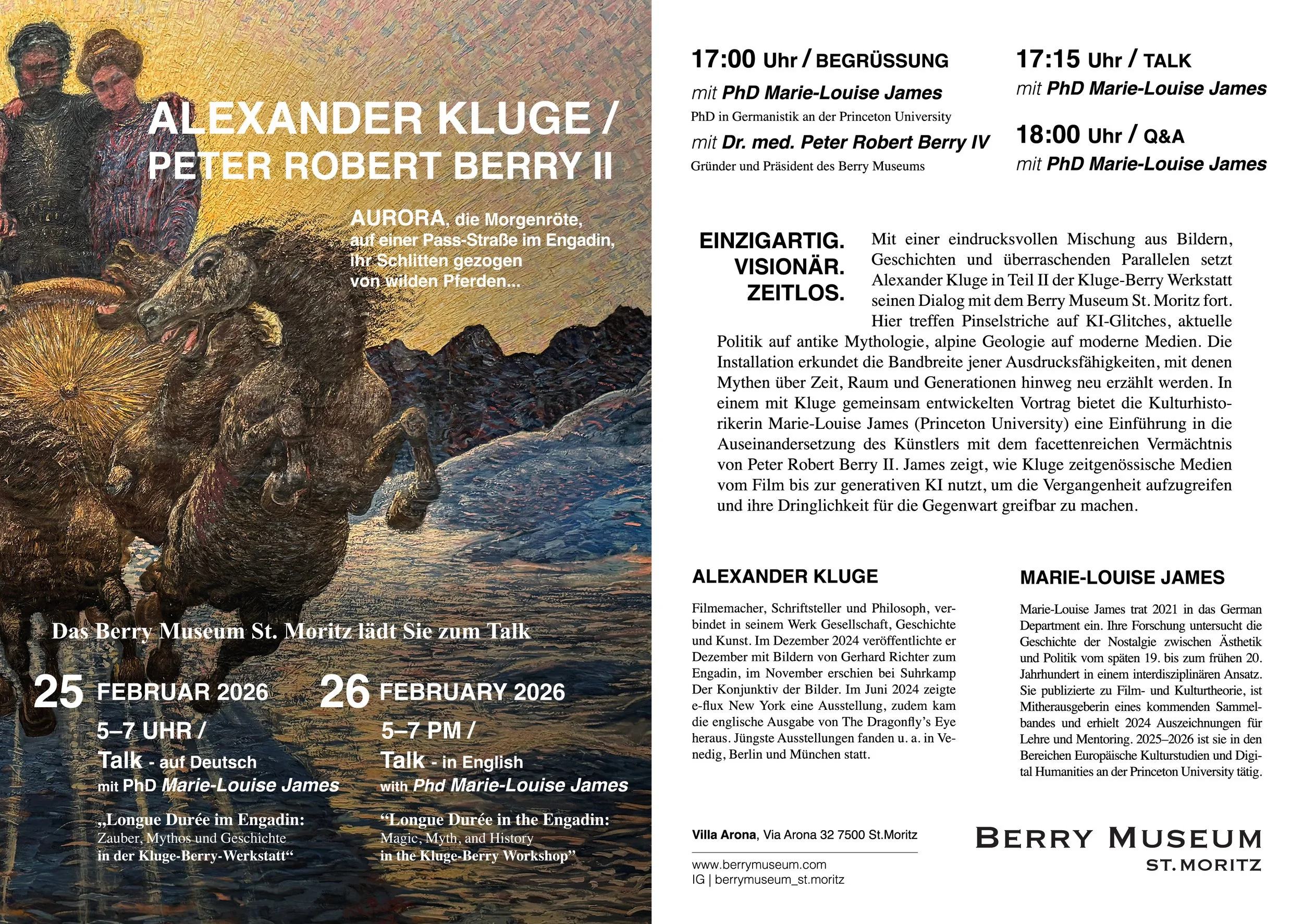In der Jubiläumsausstellung des Berry Museums treffen Perspektiven von Alexander Kluge auf das vielschichtige Erbe von Peter Robert Berry II (1864-1942), Künstler und Arzt im Engadin. Mehr lesen